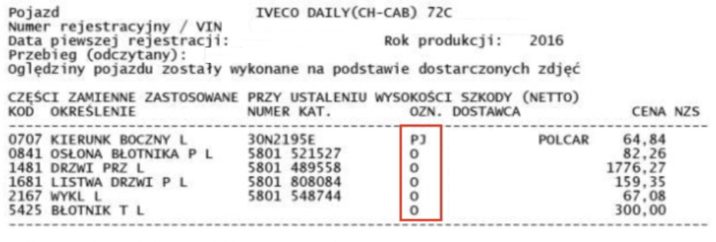To właśnie w pełnym kosztorysie widać, czy zastosowano części oryginalne, Q, PC, PJ, P lub ZJ.